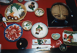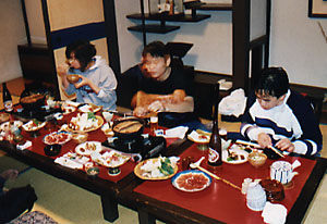 温泉から上がり、待望の猪鍋を食べる。「いただきまーす!」