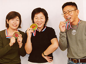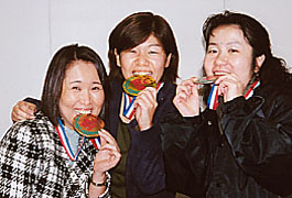 わんこそば大会 女性の部の優勝(金)は石山さん、準優勝(銀)は峯川さん、3位(銅)は椎橋さんでした。