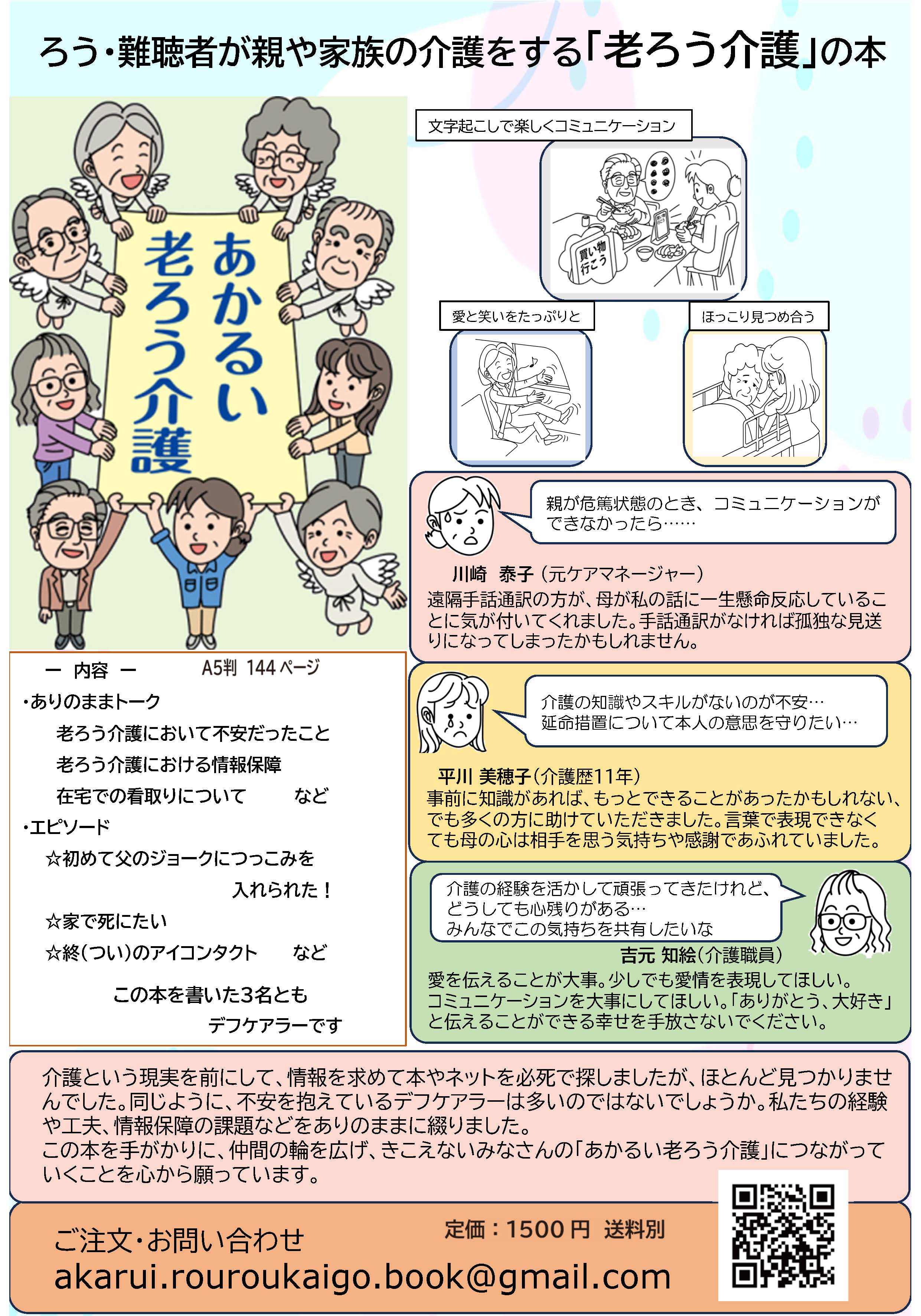 介護という現実を前にして、情報を求めて本やネットを必死で探しましたが、ほとんど見つかりませんでした。同じように、不安を抱えているデフケアラーは多いのではないでしょうか。私たちの経験や工夫、情報保障の課題などをありのままに綴りました。この本を手がかりに、仲間の輪を広げ、きこえないみなさんの「あかるい老ろう介護」につながっていくことを心から願っています。