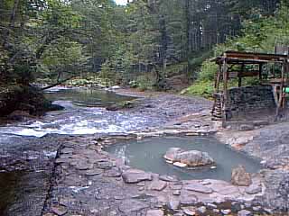 ここは温泉に含有するマンガンが自然に析出しているそうです。大変珍しいらしい。 ということで、滝の上にある湯たまりは入浴禁止。下の方に、コンクリートと岩で露 天が作ってあり、こちらに入浴します。ロケーションはまずまずだけど、なんだか池 みたい。浴槽にはあちこちに、マンガンがこびりついていて、足が茶色に染まる! あんまりいい気持ちじゃなかったなあ。(hinase)