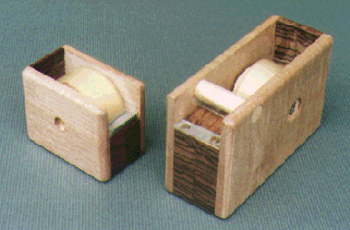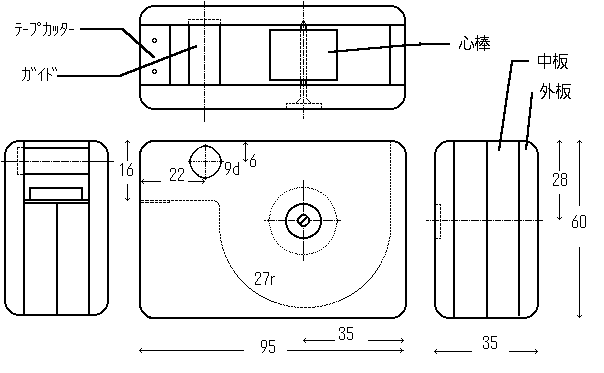 2種類、4枚の小片を接着だけで組み合わせた構造です。中板 2枚はテープを収納するよう繰りぬいてあり、心棒にはめられたテープはガイドとカッターで引き出され/カットされます。