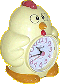 | が、この平和賞を差し上げたい人というのは、実は人ではなく「ニワトリさん」なのだ。 「ニワトリさん」とは、我が家にあるニワトリさんの形をした目覚まし時計である。 彼(彼女?)は大阪人であり(?)、けっこうど派手な声で鳴く。 時間になると、 「わて、はりきって起こしまっせぇ、コケコッコォ〜、コケコッコォ〜、コケコッコォ〜。」 ひとしきり鳴き、目覚ましを止めると、 「おはようさん。」 と言う。 菜月は、このニワトリさんが大の苦手。 勝手に目覚ましのボタンを押しては、ニワトリさんが鳴き始め、びっくりして、一緒になって菜月が泣く。 そこで、 「ほら、ねんねしないとニワトリさんが鳴くよ。」 と言ってみたら、なんと、ほんとにねんねするようになった。 これを谷口家では「ニワトリさん効果」と呼んでいる。 |