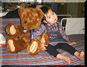 | 最近、歯磨きする時には 「バイキンがついてるから、取ろうね。」 と言いながら歯磨きするんだけど、 「バイキン、どこおるかなぁ?あ、おった、おった。ここだ!」 と奥歯を歯ブラシでゴシゴシしていたら、菜月がおもむろに 「おったねぇ。バイキンねぇ、かぁいぃ〜」 「.....」 そして、ふと目があった私の顔を見て、にこっとほほえみ、 「かぁさんも、かぁいぃ〜」 「かわいい」っていったい... しかも、バイキンと並べて「かわいい」と言われる私っていったい...(-_-;) そういえば、パン屋で、棚に並んだパンを指さして 「おぉ、あたらしい、あたらしい!」 と大声で連呼された時もかなり閉口したが、この「かぁいぃ〜」も、要は、覚えた言葉をあらゆるところでフル活用してみたい、と言ったところなのであろうか? |