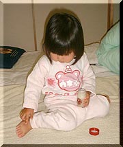 ![]() 寝る前には、かぁしゃんと一緒に 「かかとクリーム」をぬるのだ(^^;;; (1歳10ヶ月) |