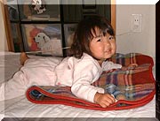 | 菜月、1歳11ヶ月。 いつの間にか、クマさんのひざかけがないと寝れなくなってしまった今日この頃。 もっと正しく言うなら、「クマさんのひざかけ」ではなく、「クマさんのひざかけについた洗濯タグ」なのだけれど... なぜに、そのタグがそこまでお気に入りになってしまったのかは、いまだもって謎のままなのである。 |