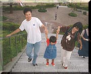 | そして、先日のこと。 さて、帰ろうかと砂場に散らかったおもちゃをかたづけて、ふと見ると、菜月が1人でどんどん公園のはしまでかけて行っている。 菜月の少し前には、一成君を連れたお母さんが階段を登っている。 もしかして、一成君のお母さんと私を間違えて追っかけて行っちゃったのか、と思ったその時、公園のはしで立ち止まった菜月が一成君のほうにむかってバイバイしたのだ。 そして、振り返り、うれしそうな顔で、またこちらにかけてきた。 それは、いっけんなんでもない光景だけれど、私にとっては、ほんとにほんとにうれしい光景だった。 「バイバイしたの。一成君に。」 うれしそうに言う菜月。 菜月は、一成君にバイバイするために、公園のはしまでかけて行ったのだ。 ブランコに行くにも、滑り台に行くにも、いつもいつも私の手をひいて、一緒じゃないといけない菜月が、私の手から離れて、1人でかけて行った。。 一時も私のそばを離れることのできなかった菜月も、いつの間にか、こんなに成長していたのだった。 |