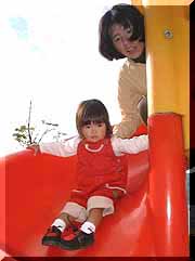 | ただ、子供の身の回りの世話に明け暮れた最初の1年。 これが、1歳をすぎ、お乳を卒業し、夜も寝てくれるようになり、だんだん大人と同じものが食べるようになると、身の回りの世話という面に関しては、ずいぶん楽になるのだけれど... そのわりに、ちっとも楽にはならなかったりするのだ。不思議と。 なんせ、1歳をすぎ、歩くようになり、しゃべるようになり、自我が芽生えてくると、一筋縄ではいかなくなってくるのだ、これが(^^ゞ それぞれの性格もはっきり出てくる。 菜月はと言うと、人一倍人見知りがはげしく、すぐにまわりとうち解けるというタイプではない。 慎重で、こわがりで、泣き虫で、自分よりずっと小さな子に物をとられても、 「とられちゃったの...」 と、私のところに帰ってくるような子なのだ。 そのわりに、おうちの中では、「傍若無人」だったりするのだが...(^^;;; とにかく、一時も私から離れることが出来ない。 いつも私の手をひき、デパートなんかにある子供の遊び場にさえ、1人ではけして入っていけないような子なのだ。 |