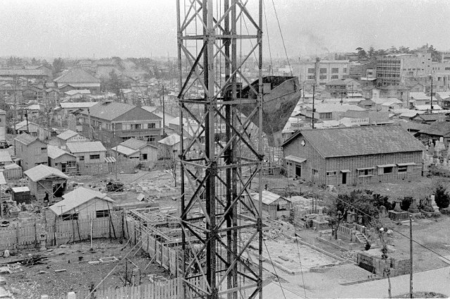 上の写真と同じところをやや山手の方からとったもの。新築の建物の色から、被災した部分が何となくわかるだろうか。