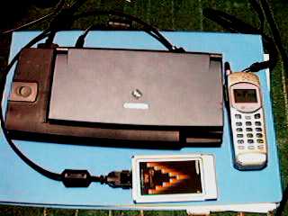 向かって上がカシオペア本体、右側がαDATA32対応のPHS(京セラPS-901) 一番下がデータ通信カード(Panasonic KX-PH402D)