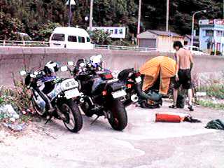 夜は2時くらいまで話をして時間をつぶし、翌朝、6時に起き、僕は早速釣りを開始。 とにかくフグの大量、やっと釣れた別の魚は、ニシキベラ、 悔しい思いをしました。 帰りに僕が車と接触した(γはほとんど無傷)以外は何事も無く 実に楽しいツーリングでした。