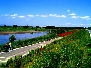 神社の横を抜け堤防をかけあがると河川敷に赤い花が群生しているのが見えた。ここがフラワーカナルらしい。