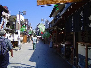 右手に映画の碑が建っている。柴又は帝釈天、寅さんと切っても切れない関係となっている。柴又街道を渡ると両側にだんごや、せんべい、仏具やなどがぎっしりと並んだ参道である。