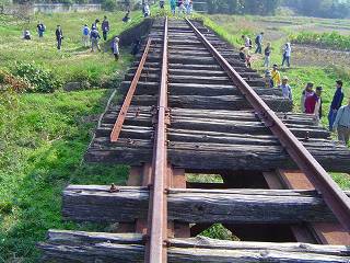 崩れ落ちそうな橋梁を見ながら、埋もれながらもわずかに頭を出している鉄路を歩き、森のなかをわき見しながらやがて線路が林の中に消えてしまう所まできてしまった。しかしその先にも葛がからみついた架線柱が幾本か残っていた。