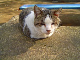 境内のベンチにおっちゃんが座って一杯召し上がっている、その後に大きな図体の老猫が物憂げな顔をして丸くなっている。かなりお歳のようで目やにも出ている。しかし悠然とした貫禄に気負けしそうである。
