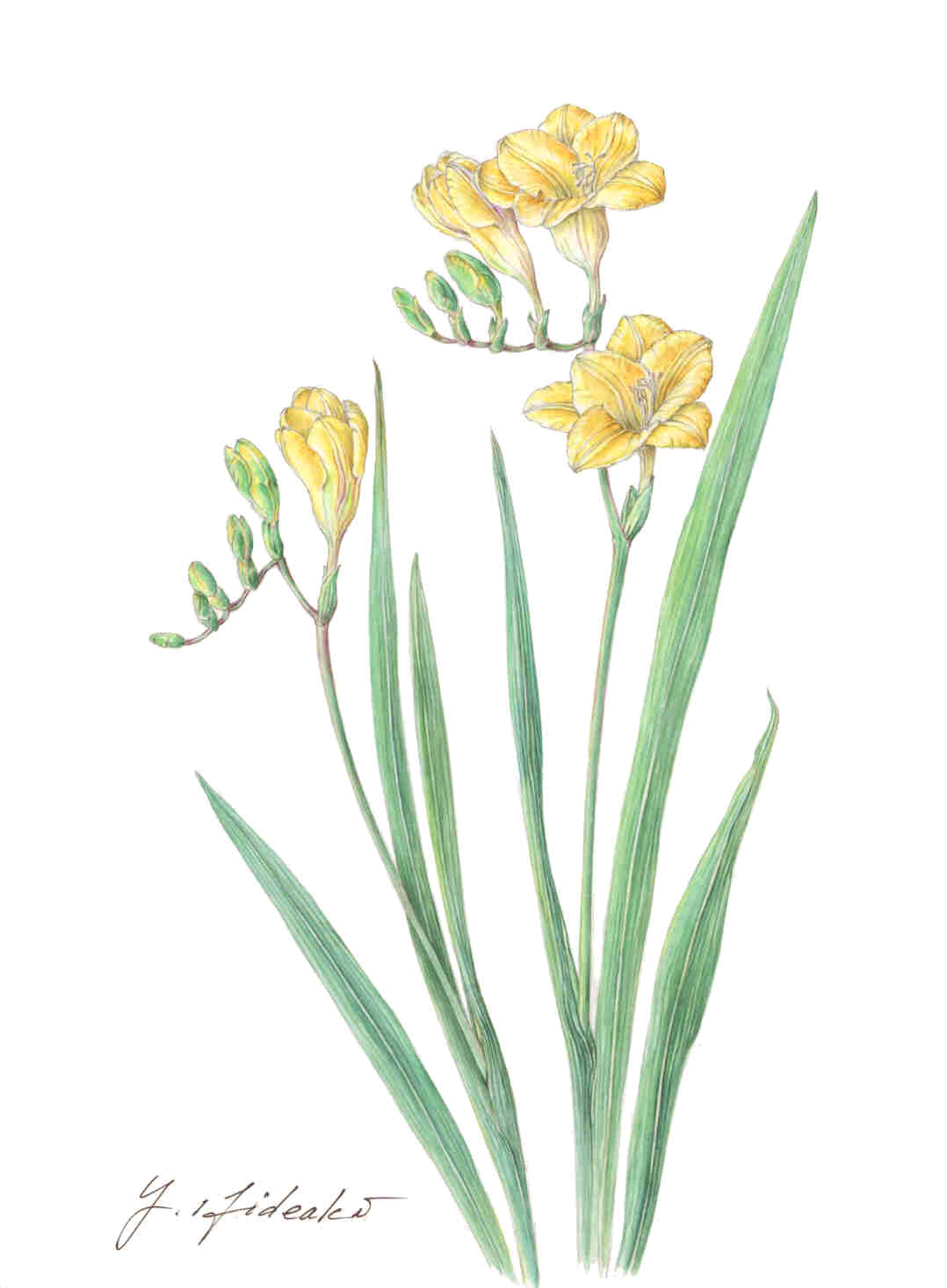 | 漏斗状の花姿が可愛いフリージアは、甘い香りも魅力ですが、 最近は品種改良のせいで、さほど香りは強くないようです。 南アフリカが原産で、本来は秋植え、春咲きですが、 オランダからの輸入により、現在では1年中入手可能となりました。 だけど、春を告げる花の代表として、ちょっと寂しい気もしますね。 花言葉・・・未来への期待、純潔、無邪気など、 アヤメ科フリージア属 2月の花の絵、今頃になって、やっと掲載出来ました。 1月7日にバラの絵をUPして、長〜〜い間 更新出来ずにゴメンナサイ。 2/11に展示会があって、ゆっくり出来る時間がありませんでした。 で、そのあと、ギックリ腰をしてしまって、しばらく自由に動けませんでした。 長い時間 同じ姿勢をしているのは まだ今も苦痛ですが、 もう、明日から 3月、 そう、春、はる、ハル!! 私の大好きな季節がやって来たよ。 頑張らなくっちゃ!! |
