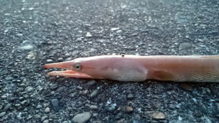 | 久々の釣行。実に半年以上竿を振っていない。ゆったりと出発したのは23時50分 高齢化したレガシーで西名阪道を東へ進む。2時間もかからず大内山のえさ吉に到着。 今回のターゲットはもちろんミノカサゴ。マニアックな獲物を狙って3年目。シーズンは少々早いけど、取り敢えず身エサの冷凍イワシを… あれ?マルイチのイワシが無い。 以前売っていたイワシも無い。で、適当に買ったのはカタクチイワシ10匹入り3パック。 夜明けの一発マダイ狙いのユムシは品切れで、アオイソメも500円×2パック買うが如何せん量が少ない。 餌のバリエーションがお気に入りのえさ吉だが、値段は他店より2割高。ただ、活イワシ160円を売っていたのはさすがである。 再び高速に乗り、古江に着いたのは4時前だった。 2本をイワシ餌、2本をイソメ餌にして夜まだ明けぬ海に投入。王様の椅子にもたれ、穂先がかすかに確認できるまだ暗い空をバックにイソメ竿を見ていたら早くも右側の竿が微妙に震えた。 二度目のアタリでサーフリーダーを手にしてパワーエアロを巻く。あぁ気持ちエエ。まだ明けぬ港にリールを巻く音が拡がる。 一投目から釣れたのはキス。キスを見るのも久々だ。餌を付け替え、正面の筏に向かってキャスト。 数分後リールを巻き仕掛けを少し移動。三脚に竿を戻してしばらくすると穂先がガンガンと段をつけて入った! 先程のキスより引きがあり抵抗する。エダスに食らいついていたのはマダイ。 ![]() 30pは切るがアイシャドーが綺麗な桜鯛。写真を撮り時間を確認すると4時半。 まさしく朝マヅメの時合いだったのか、再投入して竿を掛けたら即アタリ! 右へ右へと走るミチイト。これやがな、これ。気持ちいい〜。今度もエダスにマダイ登場。 サイズアップで抜きあげに躊躇したがエエィとぶっこ抜く。 ![]() 2匹目は30pをかるく超えている。 キスも釣れ、ここでは初めてのヒメジも来た。 ![]() イソメ500円でどれだけ釣れるんや?! さて、イワシ竿は沈黙したまんま。誘いを入れるため様子を窺うが一本目反応なし。二本目根掛かり。注意して引き抜くと重み。何かついている!海面に現れた1mを超える長い物体。 ハモ?いやダイナンウミヘビだ。 ![]() ![]() キスはともかく、マダイにヒメジ、ダイナンウミヘビと日ごろ古江で釣れない魚が今日はよく登場する。 結論から言うとイワシ餌でのミノカサゴ釣りは、このダイナンウミヘビが3匹のみ。過去あれだけ釣れたエイも釣れなかった。 イソメ餌は順調で2パック目に入ってからも3匹目のマダイやらキスにヒメジ、それにこんなハゼの仲間 ![]() トラギス、ガッチョやら賑やかな小物釣り。 ついにイワシ餌エイ。 満潮の午前9時前、イソメ餌はアッと言う間に無くなり、買い足し行こうかと思ったが、陽射しも強くなってきたし、餌を追加して余りエエ目をした記憶もなく、ミノカサゴは次回と言うことで4時間の今年初釣行は終了。 帰路は山越えで140q(往路は高速で220q)昼前に帰宅。 持ち帰ったマダイは煮つけに塩焼き、刺身となりどれも絶品。 そしてヒメジの煮つけの美味いこと!雑魚は何故か美味い! |
