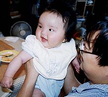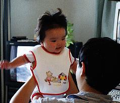 パパのおひざの上でたっち。 おひざでたっち…させてもらえるなら、どんな奴にでも微笑みかける節操のないあゆちゃん。 |