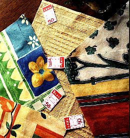 日暮里繊維問屋街(JR日暮里駅から徒歩約5分) は布のデパートがひしめく一大繊維集積地。 ここで、オシャレなテーブルウェアを作るための材料を 鼻血が出るような安価でゲットする。 もとはおそらくカーテンの、ハギレ布だろう。 店先には、あたかも「こんなもん、邪魔!」と 言われて放り出されたかのようなダンボール箱が。 もがくように中を漁ると、出るわ出るわ、堀出物の ハギレ布。 財布の余力がある内に、こういう所でバトルしておく と、あとあと何かと便利である。 |