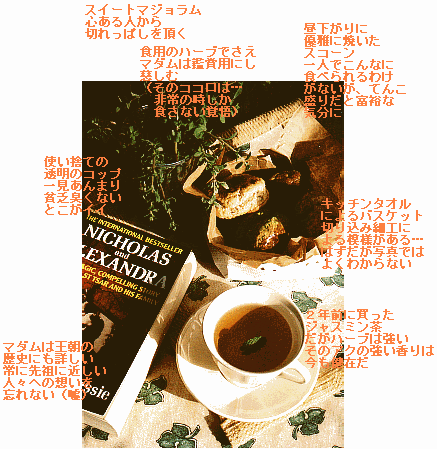 というわけで、行ったこともないイギリスの田舎の 農家風 afternoon tea をイメージして、 テーブルにセットしてみた。 うむ、貧乏臭さが微塵も感じられない。満足。 「スコーン(プレーン)の作り方」 「スコーン(抹茶)の作り方」 「紙タオルによるバスケットの作り方」 |