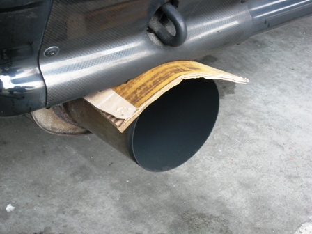 あはは、直管100φマフラ〜。正楽が緩衝材を入れてます(笑)。