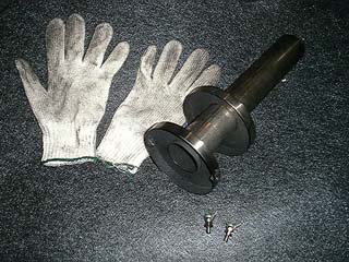 んで、これがインナーサイレンサーアッシーです。サイレンサー本体と、蝶ネじ。 それと軍手セット(笑)。まあ、あんまし使わないけど。