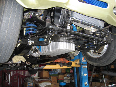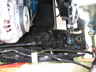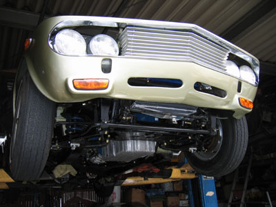 エンジン下回りです。フロントから衝突すると、まずハンドルが効かなくなって、