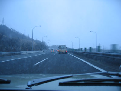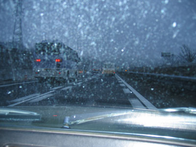 やっぱし〜、雪、こんな感じ。前方に礼儀作法を弁えないトラック2台発見。とにかく