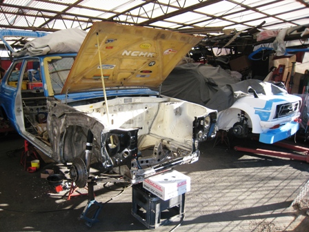 KPのレース車両製作中。向うはサニー製作中。何でも鈴鹿と富士で30台くらいで