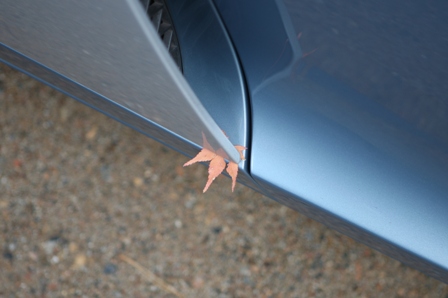 あはっ、デイトナのタイヤを見てたら、お隣のR8 のインテイクフードに紅葉したモミジが1枚(笑)。。。