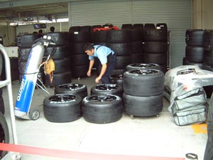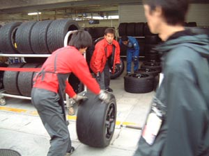 天気予報を遵守して、レーシングレインの手配を始めました。転がしてるのはSタイヤ
