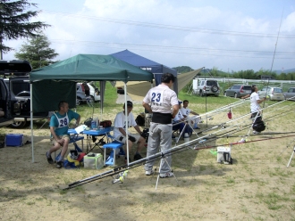 | 開会式。ゼッケンを付けて既に戦闘モード。 | 暑さ対策。テントがないとやられてしまいます。 |