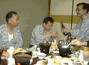 到着。風呂に入ってまずは1局。宴会ではもろもろの話題がとびかう。名人戦は・・