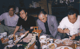鳥取支部長、田中さんのご挨拶。おいしい海の幸にほろ酔い気分。宴のあとは対抗試合。