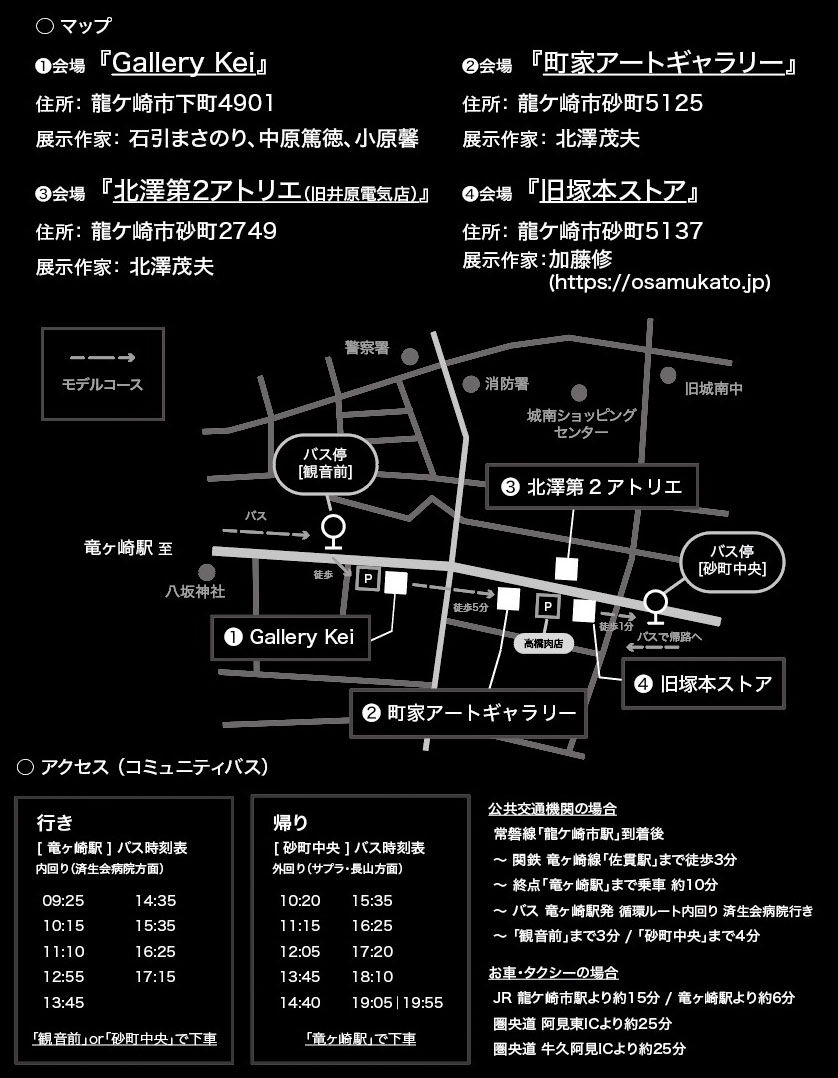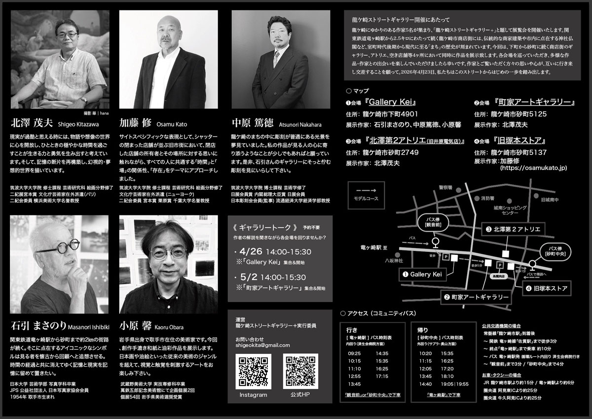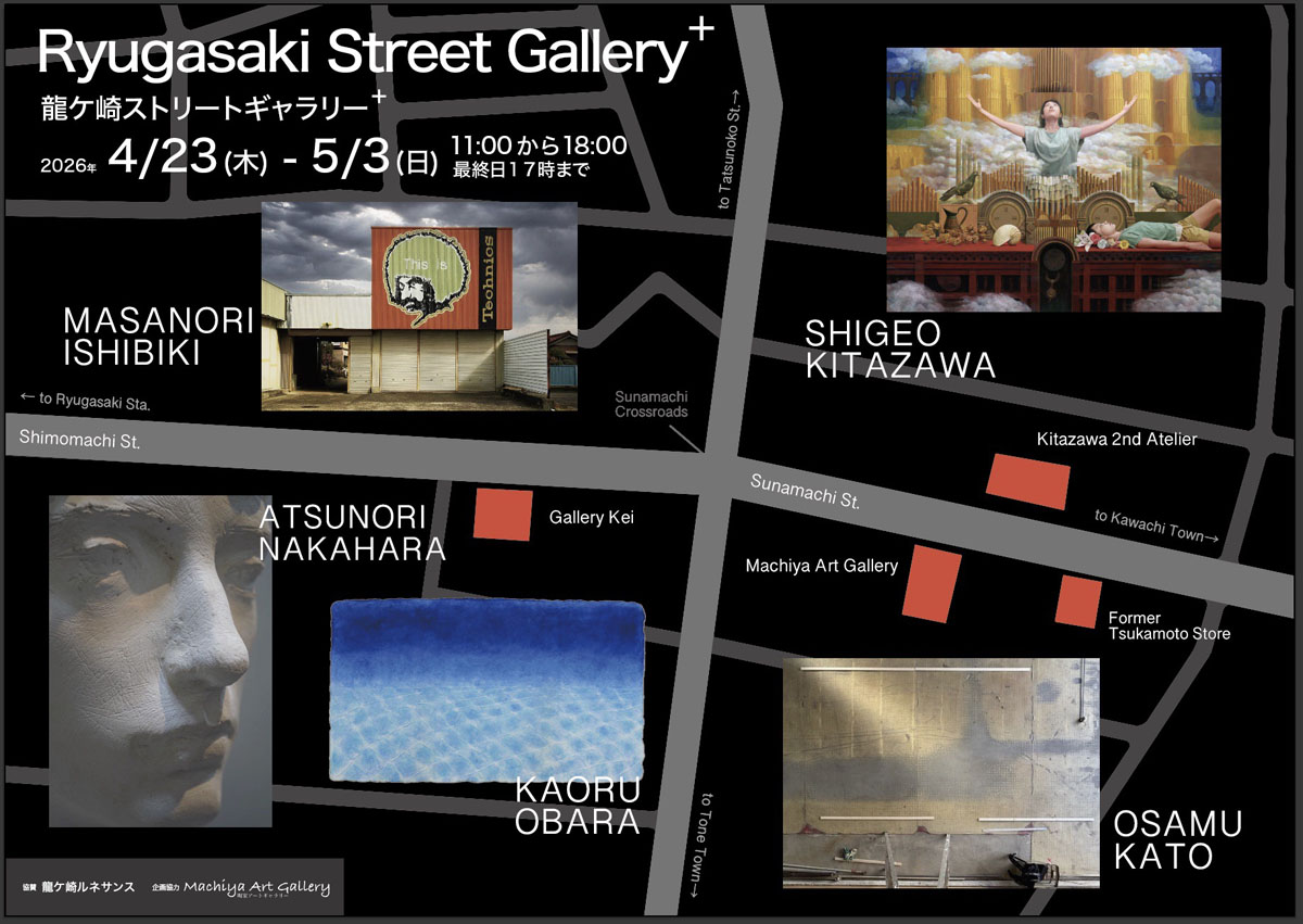 龍ヶ崎にゆかりのある作家5名が集まり、「龍ケ崎ストリートギャラリー+」と題して展覧会を開催致します。関東鉄道竜ヶ崎駅から2.5キロにわたって続く龍ケ崎商店街には、伝統的な商家建築や市内に点在する神社仏閣など、室町時代後期から現代に至る「まち」の歴史が刻まれています。今回は、下町から砂町に続く商店街のギャラリー、アトリエ、空き店鋪等4ケ所において同時に作品を展示致します。各会場を巡っていただき、多様な作品・昨家との出合いを楽しんでいただけましたら幸いです。作家とご覧頂く方々の思いや心が、互いに行き来し交差することを願って。2026年4月23日、私たちはこのストリートからはじめの一歩を踏み出します。 |
