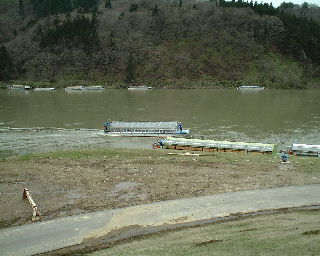 | 天童からレンタカーで北上し、最上川下りの乗船場のある戸沢村へ。写真は乗船場となっている旧戸沢藩船番所。 | 乗船時間は約55分ほど。一人1980円。この日は雪解け水の影響か水量が豊富。松尾芭蕉も舟下りしたそうである。 |