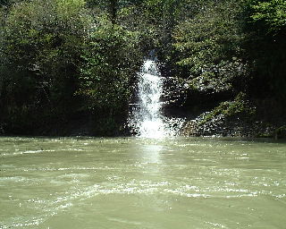 | 船内では船頭さんが楽しい話をきかせてくれる。 | 船は渓谷のなかを突き進み両岸には48の滝が見ることができる。 |