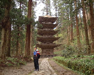 | 下船後、レンタカーで羽黒山へ。月山、湯殿山、羽黒山の三山を出羽三山といい、山岳修験の霊場として有名。 | 早速山頂の神殿を目指して石段を進むと五重の塔が現れる。平安時代に作られたといわれ、現在のものは室町時代に再建されたもの。 |