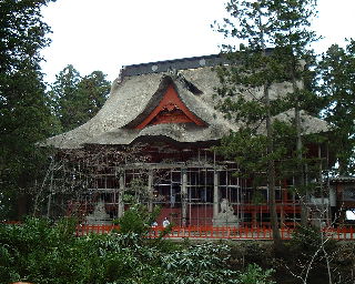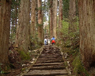 | 山頂まで2446段の石段を上がる。両脇には大きな杉並木が続く。前日の山寺とは比較にならないほどしんどい。 | 何度もくじけそうになりながらも何とか山頂の社殿へ。羽黒山頂にある神殿に詣でれば出羽三山全てに詣でたのと同じことになるそうである。 |