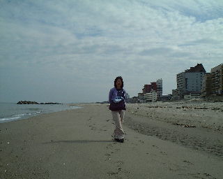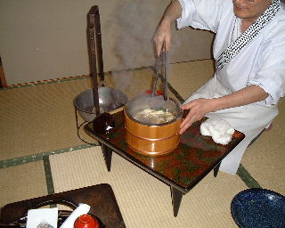 | この日は日本海まで抜けて湯の浜温泉に宿泊。写真は夕食に出された「わっぱ煮」。海産物の入った味噌汁に焼いた石を入れて煮るというこの地方の漁師料理。とてもおいしい。 | 宿泊したホテルの目の前は日本海。前日は鳥海山がはっきり見えたが、この日の朝は天気がイマイチで見えなかった。 |