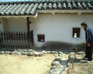 | 築城時の状態で保存されているので当然戦闘用の仕掛けもそのまま残っている。壁にある四角い穴は鉄砲や弓矢で敵を射るためのもの。 | 張り出した窓の下からは石や槍などを真下の敵に浴びせることができる仕掛けになっている。 |