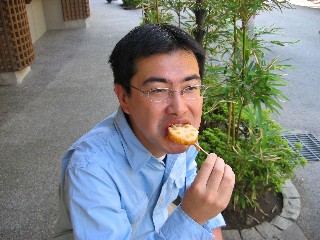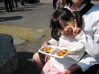 | 庭園から見える錦江湾と桜島。鹿児島に来たなあと感じる眺め。 | 庭園内で売っていた「両棒(ぢゃんぼ)餅」。ぢゃんぼとは鹿児島弁で武士の大小の刀のこと。餅が2本の串に刺さっている。仙巌園に向かう道路沿いに両棒(ぢゃんぼ)餅のお店がたくさんあった。 |