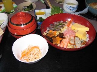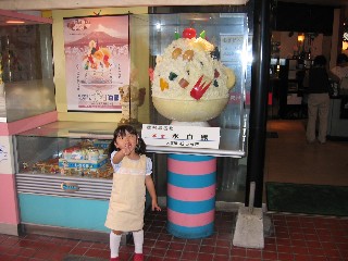 | その後鹿児島市内に戻り、天文館通りにある「味の四季」という店で昼食として鹿児島名物をいくつか食べた。写真は酒ずし。この他きびなごの刺身やさつま揚げを食べた。特にさつま揚げは揚げたてでおいしかった。 | 食後のデザートに同じ天文館通りにある「むじゃき」で有名な「白熊」を食べようとしたが、おなかが一杯だったので持ち帰りにし、帰りの飛行機で食べた。ミニサイズでも十分なボリュームでとてもおいしかった。 |