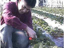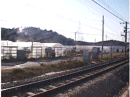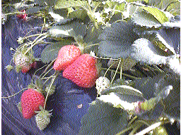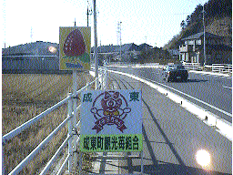 | 99年2月旅行というほどではないが、外房にある成東町へいちご狩りに行った。千葉から車で1時間弱。 | 成東町はいちごで有名。町にはたくさんのいちご農園がある。一番最初に見つけた石田農園に入る。 |