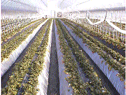 | いちご狩りのシーズンは1〜5月。私はいちご狩りはこれが初めて。線路を隔てたビニールハウスへ案内される。 | ビニールハウスの中はいちごの苗木でいっぱい。外はまだまだ寒いがハウスの中は暖かい。 |