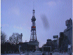 | 今は大きなビルの谷間にポツンと存在する。観光客の中には大草原の中にあるかのようにイメージしていてがっかりする人も多いらしい。 | 大通り公園から眺めるテレビ塔。大通り公園は札幌の中心部にあり雪祭りのメイン会場として有名。 |