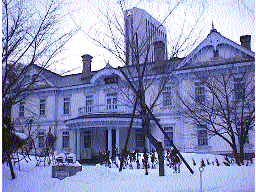 | 後ろに見えるのが現在の道庁。北海道開拓の中心となった「開拓使」以来この近辺は道政の中心地。 | 中島公園にある豊平館。明治初期に洋造ホテルとして建設され、明治天皇もお泊りになった。 |