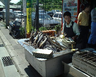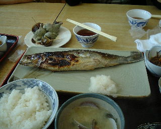 | 鰊御殿のある丘を降りるとおいしそうに鰊を焼いている店がならぶ。 | というわけで当然父と私の昼食は「にしん定食」。 |