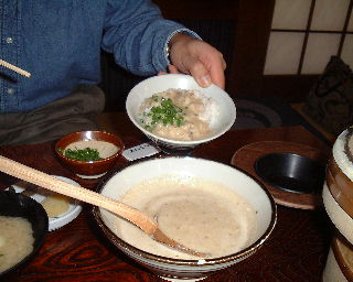 | 創業以来400年を超える老舗。とろろを白味噌で味付けしたとろろ汁を麦めしにかけていただく。3杯も食べてしまった。¥1300円。