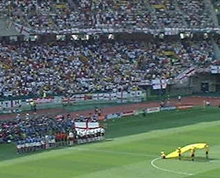 | 国歌斉唱。イングランドはおなじみのゴット・セイブ・ザ・クイン。イングランド人の声質なのか、体が大きいからなのか、男が多いからなのか日本のサポーターとは歌声の迫力が全然違う感じ。