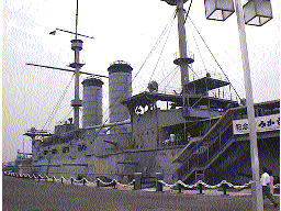 | そのときの旗艦であった戦艦「三笠」。現在は記念艦として保存され当時の記念品、資料等が多数展示されている。司馬遼太郎の「坂の上の雲」にでてくる「秋山真之」の名前もみられた。